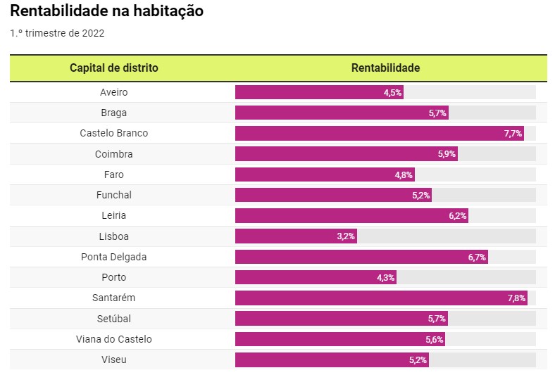 Yield por distrito – Fonte: Idealista – https://www.idealista.pt/news/imobiliario/habitacao/2022/04/13/51810-comprar-casa-e-coloca-la-a-arrendar-rendeu-5-6-no-primeiro-trimestre